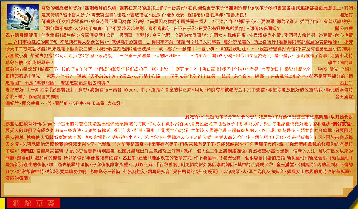→〖金玉滿堂〗:《創富網》內的猛料和六信的紅字,經常都會中特,所以你要繼續努力啊!老總送你一首詩:七弦為益友,兩耳是知音。是白居易的《船夜援琴》,此句寫琴、人耳互為良友和知音,頗具文士意趣的同時也帶有孤單、清寂的氛圍。