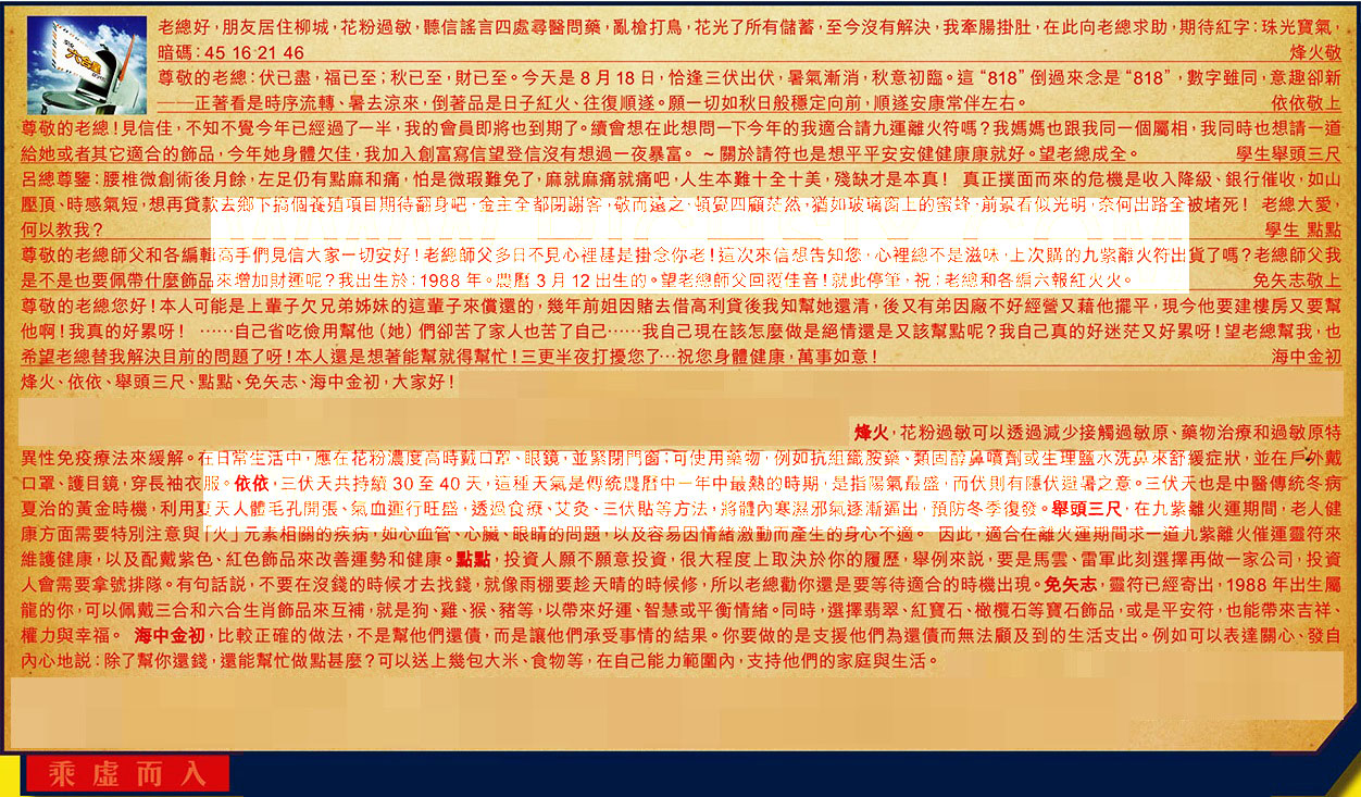 【5】.尊敬的老總師父和各編輯高手們見信大家一切安好!老總師父多日不見心裡甚是掛念你老!這次來信想告知您,心裡總不是滋味上次購的九紫離火符出貨了嗎?老總師父我是不是也要佩帶什麼飾品來增加財運呢?我出生於:1988年。農曆3月12出生的。望老總師父回覆佳音!就此停筆,祝:老總和各編六報紅火火。 免矢志敬上