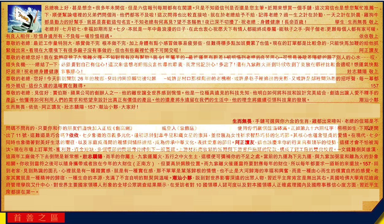【1】.呂總晚上好,甚是想念。很多年未開信,但是六信報刊每期都有在閱讀。只是不知道信刊是否還是您主筆。近期來想買一個手鏈,這次寫信也是想您幫忙推薦一下,順便幫論壇裡的兄弟們問個肖,他們都等不及啦!這次問得也比較直接哈,就在於老總給予不給,記得老總?過一生之計在於勤,一天之計在於晨,雞狗牛都是勤力的好幫手,我甚是喜歡這句名言。不知老總有何高見?望不吝賜教!夜已深不叨擾了,祝老總:身體健康!長命百歲! 學生:生而無畏 敬上