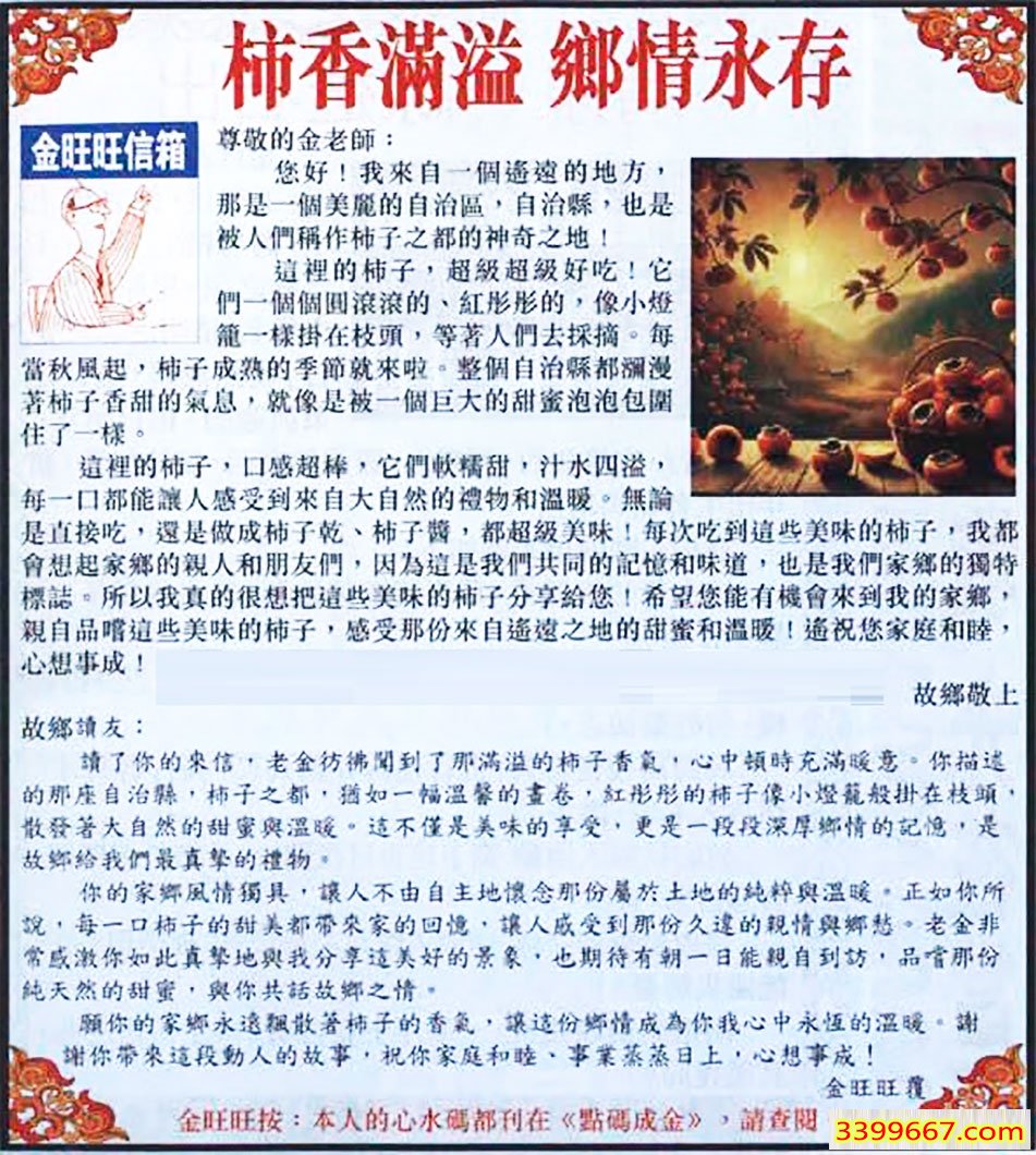 078期:金旺旺信箱彩民推荐→→《柿香滿溢 鄉情永存》