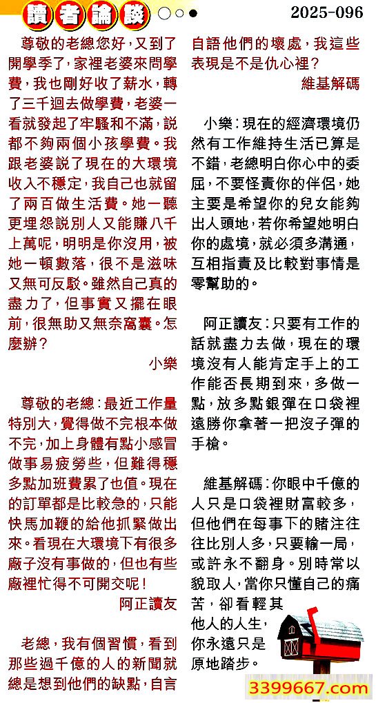 1.尊敬的老總您好,又到了開學季了,家裡老婆來問學費,我也剛好收了薪水,轉了三千迴去做學費,老婆一看就發起了牢騷和不滿,說都不夠兩個小孩學費。我跟老婆說了現在的大環境收入不穩定,我自己也就留了兩百做生活費。她一聽更埋怨說别人又能賺八千上萬呢,明明是你沒用,被她一頓數落,很不是滋味又無可反駁。雖然自己真的盡力了,但事實又擺在眼前,很無助又無奈窩囊。怎麼辦?====小樂