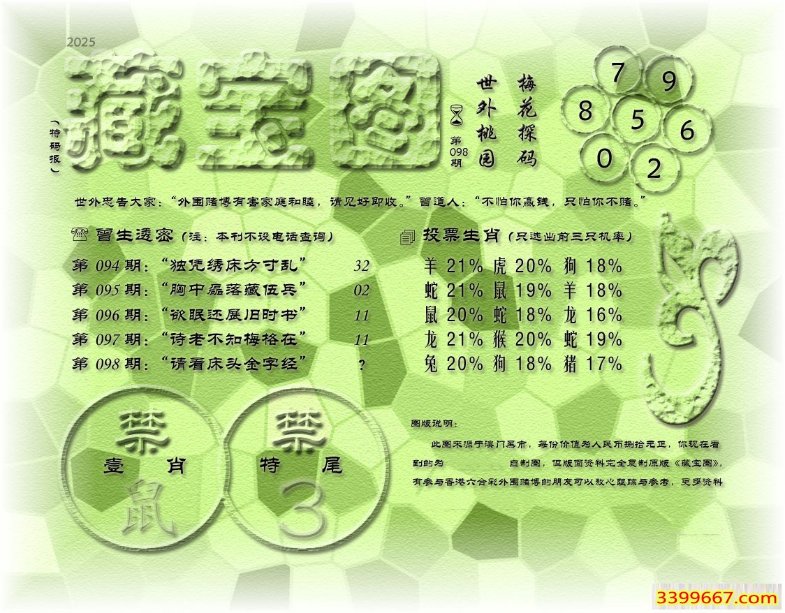 098期藏寶圖 新:寸肠争奈此情何 老:请看床头金字经 禁:鼠 禁:3尾