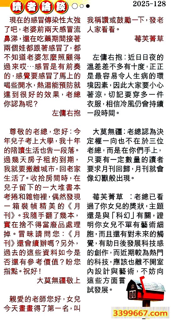 2.尊敬的老總,您好:今年兒子考上大學,我十年的陪讀生活也告一段落。過幾天房子租約到期,我就要搬離城市,回老家生活了。收拾房間時,在兒子留下的一大堆書本考捲和雜物裡,偶然發現一箱裝幀精美的《月刊》。我隨手翻了幾本,實在捨不得當廢品處理掉。冒昧請問您:《月月刊》還會續辦嗎?另外,過去的這些資料如今是否還有參考價值?盼您指點。祝好!====大莫無疆敬上