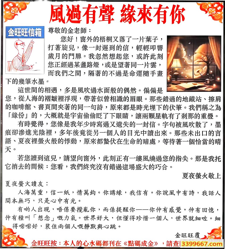 131期:金旺旺信箱彩民推荐→→《風過有聲 緣來有你》