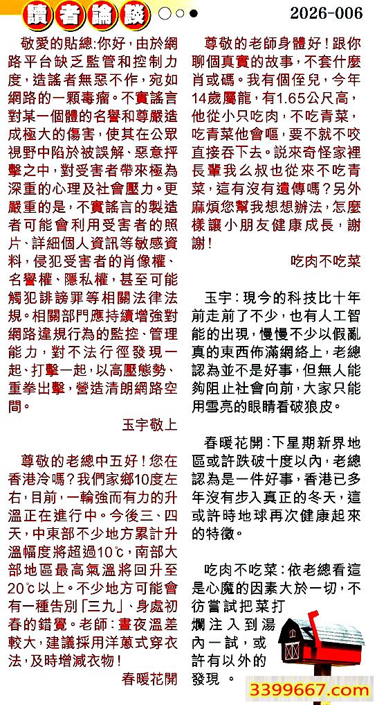 1.敬愛的貼總:你好,由於網路平台缺乏監管和控制力度,造謠者無惡不作,宛如網路的一顆毒瘤。不實謠言對某一個體的名譽和尊嚴造成極大的傷害,使其在公眾視野中陷於被誤解、惡意抨撃之中,對受害者带來極為深重的心理及社會壓力。更嚴重的是,不實謠言的製造者可能會利用受害者的照片、詳細個人資訊等敏感資料,侵犯受者害私的肖像權、名譽權、隠權,甚至可能觸犯誹謗罪等相關法律法規。相關部門應持續增強對網路違規行為的監控、管理能力,對不法行徑發現一起,打撃一起,以高壓態勢、重拳出撃,營造清朗網路空間。====玉宇敬上